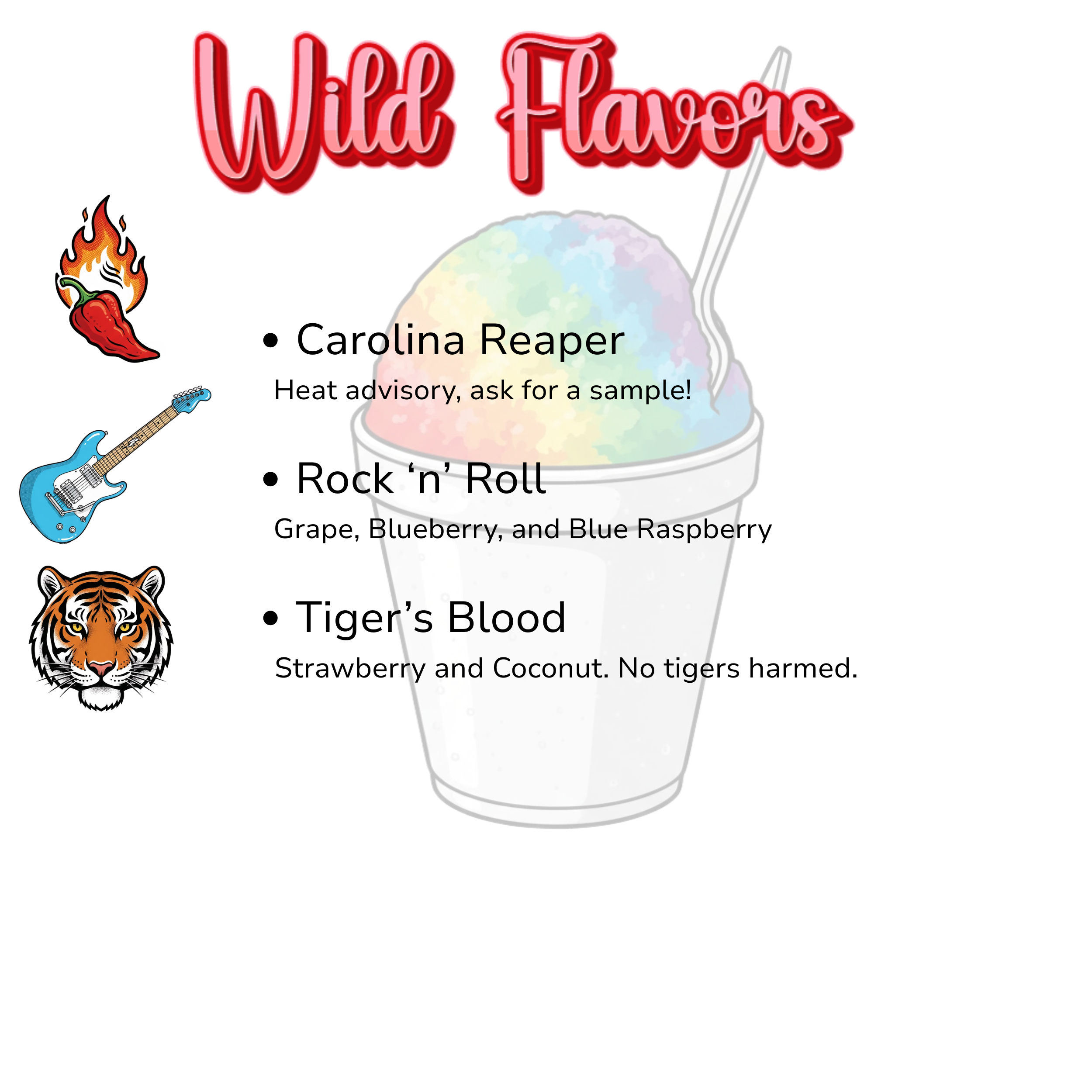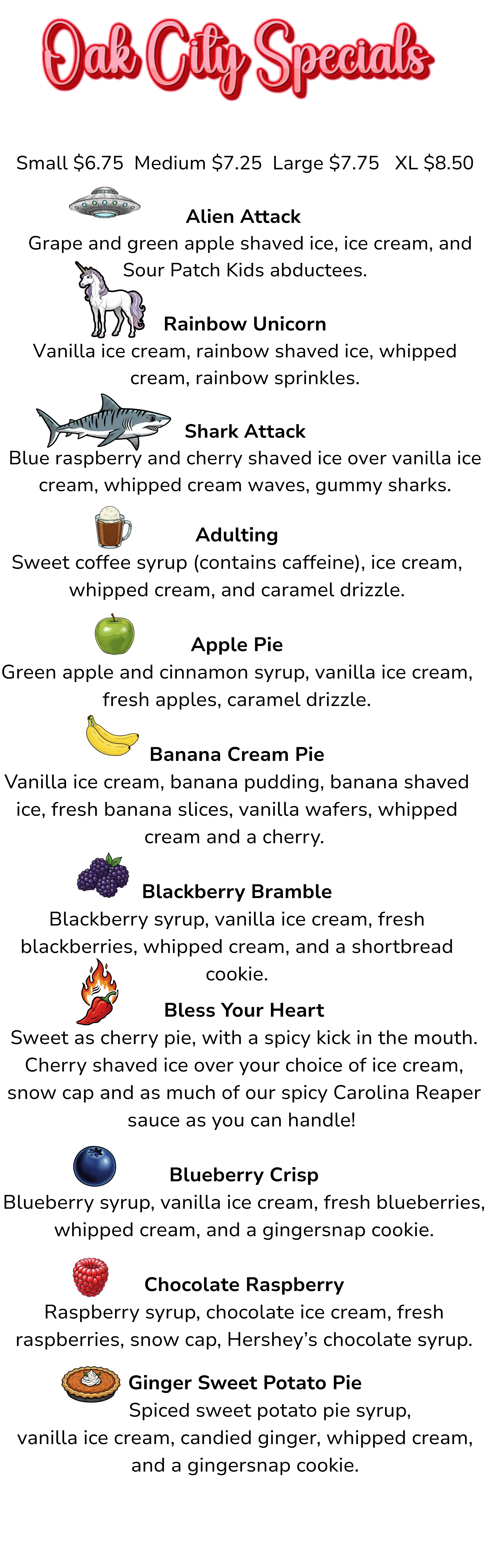 Add ice cream, fresh fruit, and sweet toppings for your perfect shaved ice dessert. Please check out our favorite combinations and Oak City Specials!