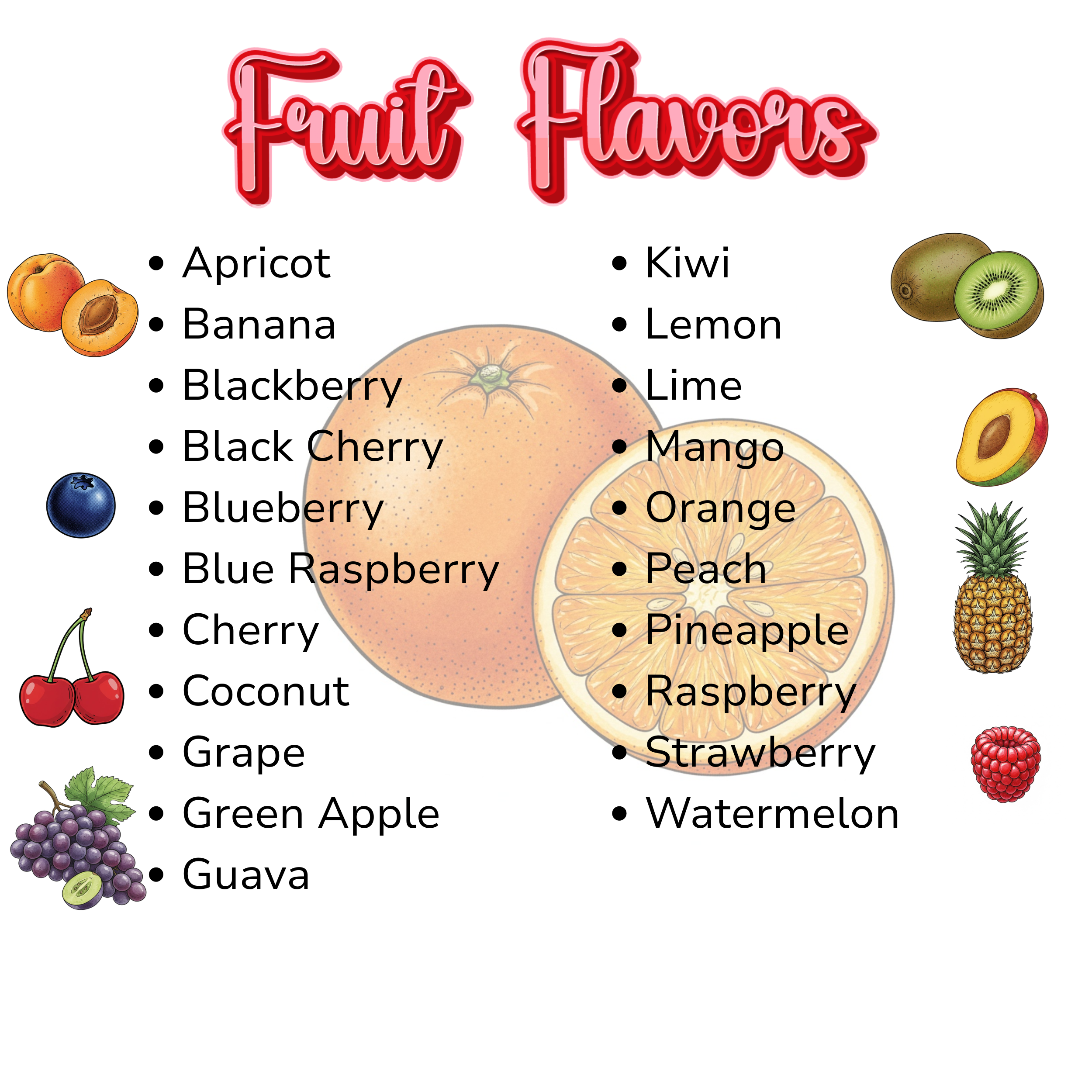 Apples, bananas, blackberries, blueberries, mango, papaya, peaches, raspberries, strawberries, tangerines